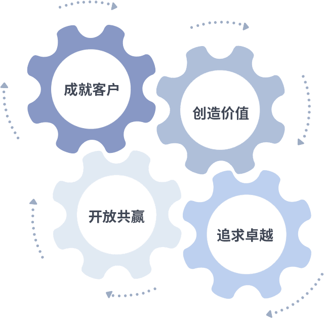 成就客户是一切决策的出发点,,,,创造价值是衡量所有工作的标准,,,追求卓越是我们做事做人的态度,,,,开放共赢是我们的格局也是最终的结果。。价值观的齿轮环环相扣,,,推动着组织里的每个人不断向前。。